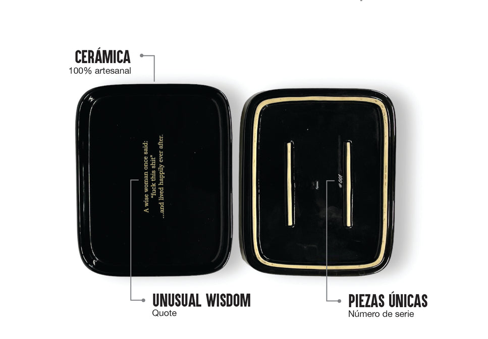 2 charolitas decorativas y contenedores (catch-all) en cerámica, con dos frases distintas de sabiduría inusual para el hombre y la mujer.